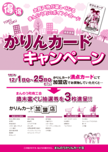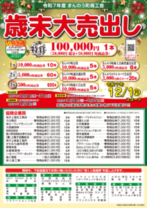 お知らせ 2025年10月30日 令和7年度まんのう町商工会歳末大売出しのお知らせ 令和7年度まんのう町商工会歳末大売出し まんのう町商工会年末大売り出しを12月1日から12月31日まで開催致します。 期間中に、まんのう町商工会年末大売出し参加加盟店でお買物頂くと、「富くじ抽選券」を進呈致します。 本年度は特賞10万円1本を新たに設け、1等1万円10本他、各賞総額100万円相当が当たる富くじ抽選会が行われます。 是非、この機会にお買物は町内加盟店をご利用下さい。 詳細は、加盟店掲示のポスターをご覧ください。