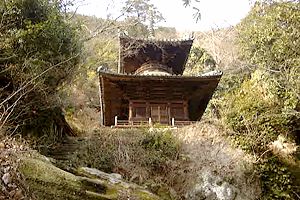 町の北部、海抜382mの弥谷山の南腹にあり、参道入口には剣五亭と俳句茶屋がある。ここからうっそうと茂る老樹の間の坂道と、300段近い石段を登っていくと大師堂に着く。